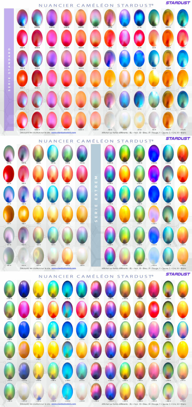 - Bien que recommandé sur fond noir, l’effet Caméléon peut également être remarquable sur d’autres fonds (gris, bleu, rouge, rose fluorescent…) pour des rendus uniques.